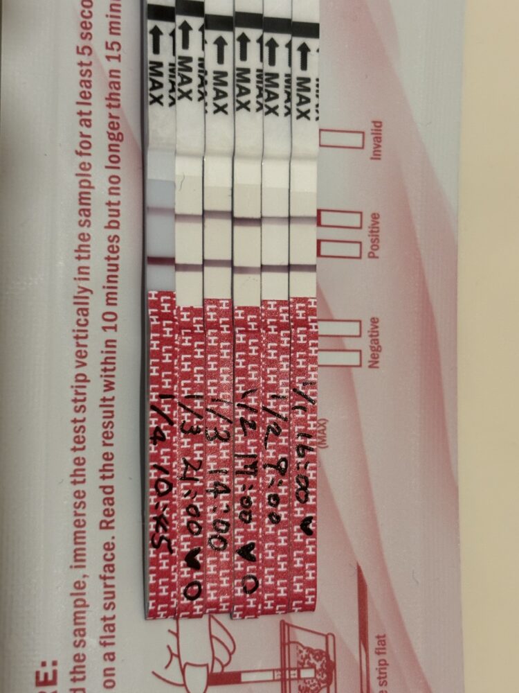 はじめまして。送らせていただいた質問が見つけられず、再度送らせていただきます。 産後生理が3回きたものの、1〜2は2ヶ月開き、2〜3は36日周期と長めです。元々36日周期くらいが多く、8/22は最終月経から16日です。排卵には早いかな?と思いましたが、検査薬を試すと反応が出ました。 8/22〜27まで検査し、 8/22 20:30 8/23 9:00 22:00 8/24 11:20 24:00 8/25 8:00 8/26 8:00 8/27 1:00 ↑の時間で検査をした画像を載せました。 8/22にのびおりを確認し、タイミングをとりました。 女の子希望の場合はもう一回タイミングを取るとしたら、どの日が良かったのでしょうか? ピンクゼリーも併用しています。今回妊娠していなければ、次回のタイミングの参考にしたいと思います。アドバイスよろしくお願い致します!