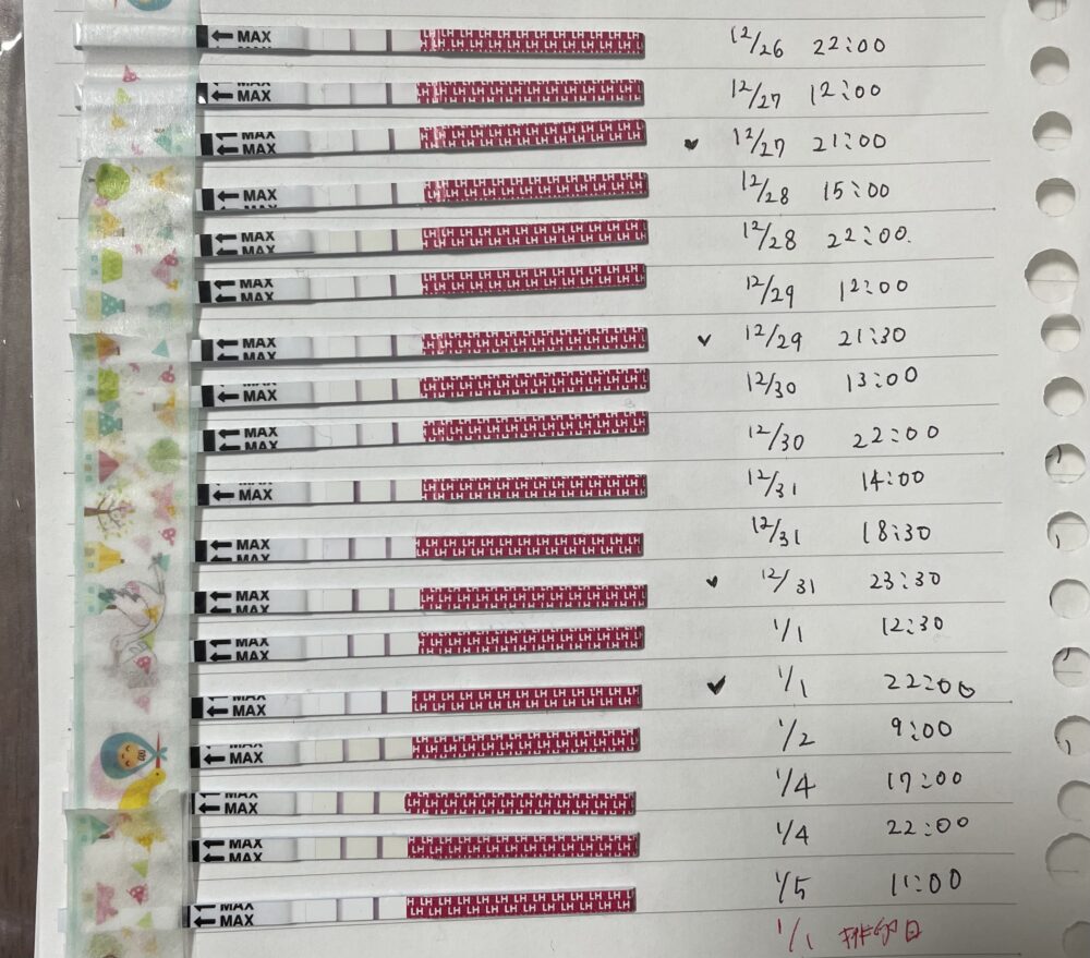 12/27.29.31.1/1にタイミングを取り、排卵検査薬の結果からすると1/1が排卵日かな?と思っております。