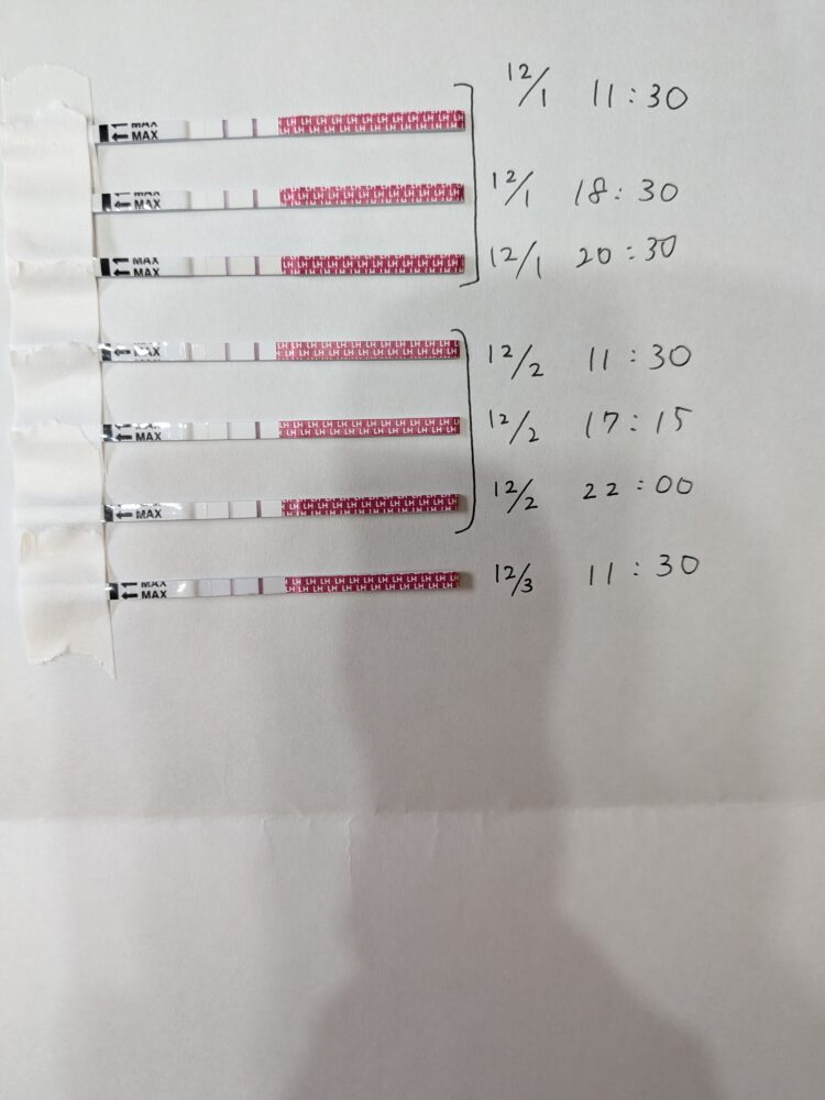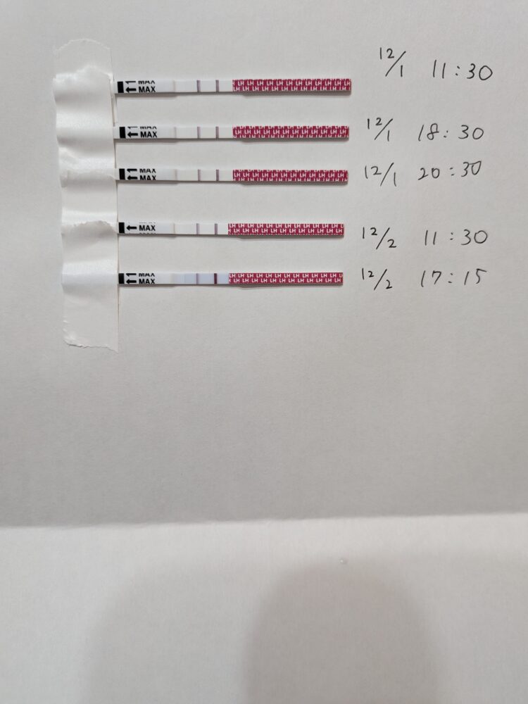ラッキーテスト排卵検査薬では、12/1のAM11:30と18:30の検査がともにくっきりとした陽性反応を示しています。