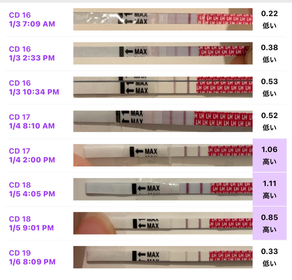 こんにちは。 画像を確認しました。 1/3(D16)夜から濃くなり、1/4(D17)朝は陽性、PM2時は強陽性反応でした。 1/5(D18)も強陽性反応、1/6(D19)は完全に陰性反応に戻りました。