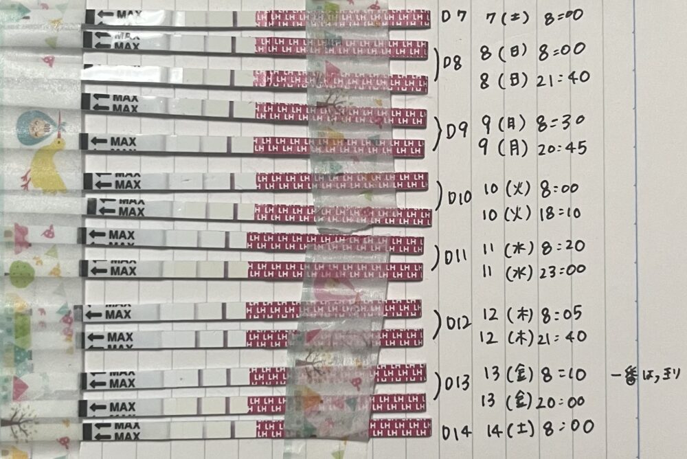 2/12(D12)夜から陽性反応になり、 2/13(D13)朝は強陽性反応、夜は陽性反応、 2/14(D14)朝は完全に陰性反応に戻りました。 排卵検査薬の変化から見れば、2/14(D14)朝に排卵した可能性が高いです。