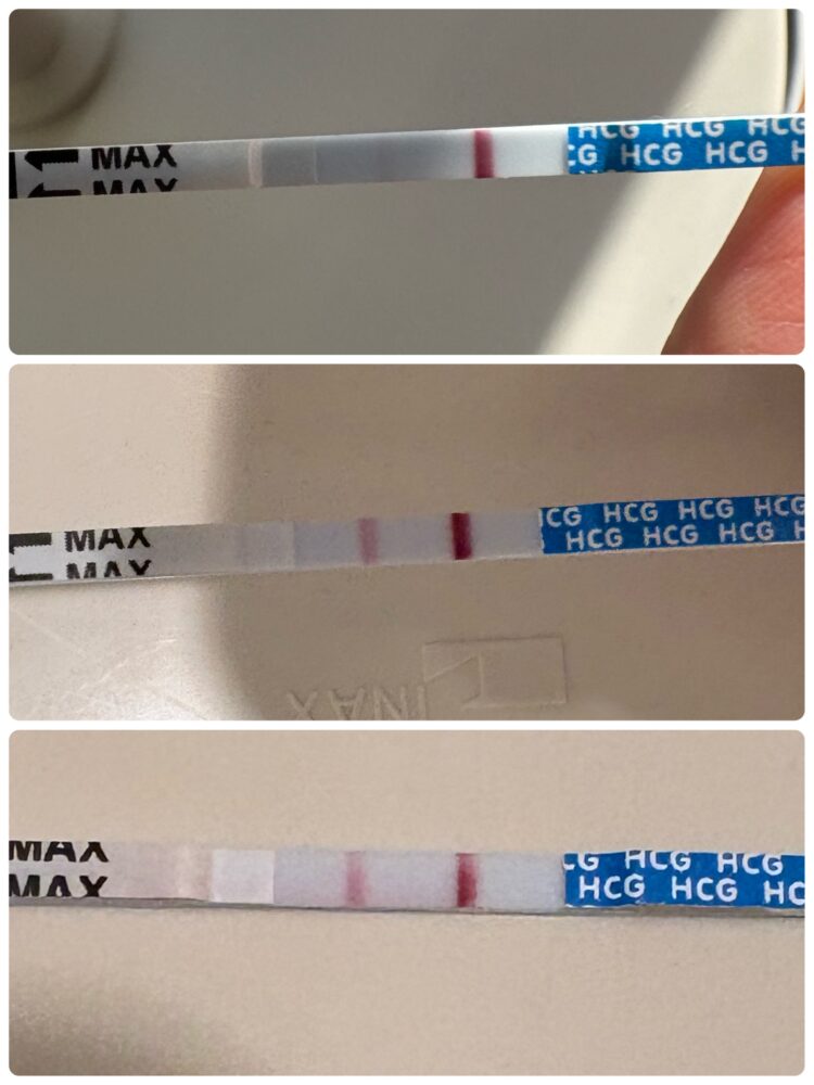 妊娠検査薬を1/17.16.20と使いました。 茶オリが出て不安で、チャットGPTに聞いたら陽性と断定するのは早いと言われました。あと何回検査したら良いでしょうか。上の画像から日付順です。