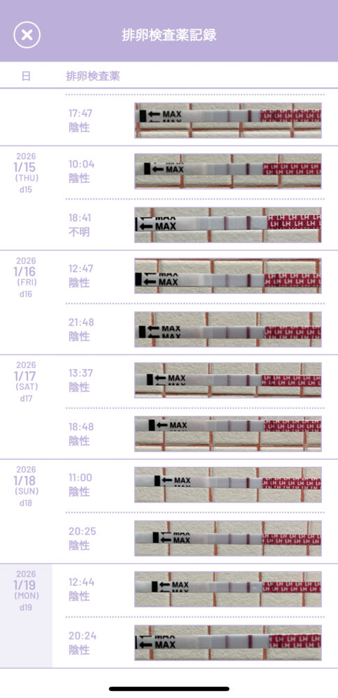 排卵日はいつと考えられますか。 基礎体温と今までの周期も合わせた基礎体温表、排卵検査薬の写真を添付いたしますので、教えていただけますと幸いです。 ちなみに1/15 18:41の検査では、検査薬の確認が40分後になってしまったため不明としています。1/19 20:24も陰性です。 タイミングはハートマークの日にとっています。