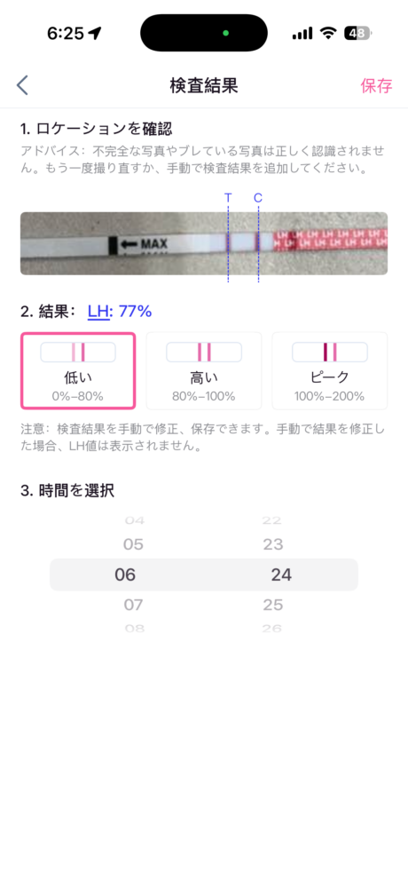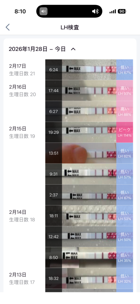 2/15の夜LHピークを確認してきます。 ピーク確認する前の夕方にタイミングを取りました。 今朝(2/17)アプリだとLH低下となりましたが、写真の撮り方によってはLH77%とも確認できますがこのタイミングで排卵したのでしょうか。排卵はもう少しLHが低下してからでしょうか。
