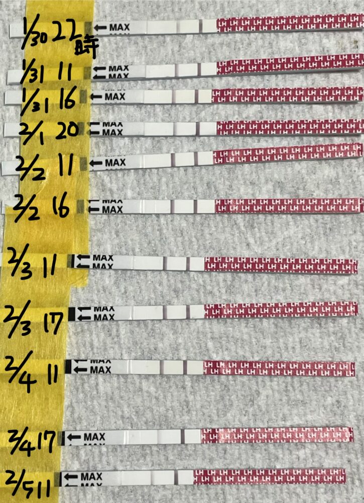こんにちは。 画像を確認しました。 2/2昼~2/3夜は陽性反応、 2/4AM11時は弱陽性反応、17時は完全に陰性反応に戻りました。 排卵検査薬の変化から見れば、2/4(D25)昼頃に排卵した可能性が高いです。