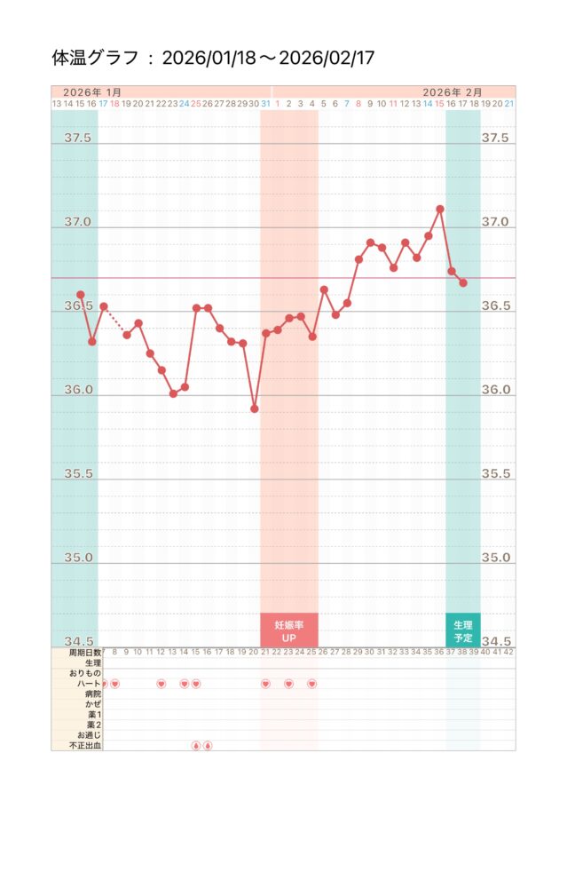 2/5は高温期1日目になります。 妊娠率を高めるには、2/2~2/4にタイミングを2回とることをおすすめします。