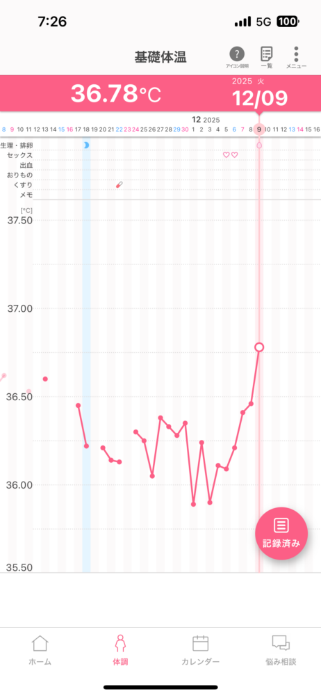今周期、12/8を高温期1日目と見ていいと思います。