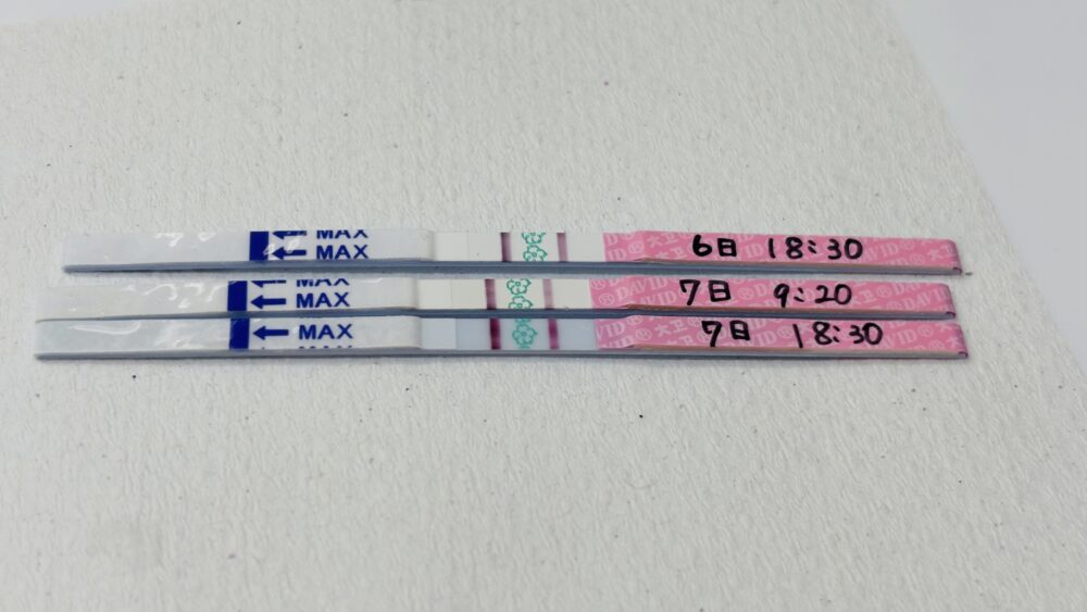 今朝の検査結果はどうですか? もし強陽性反応が続く場合、1回妊娠検査薬をしてみてください。