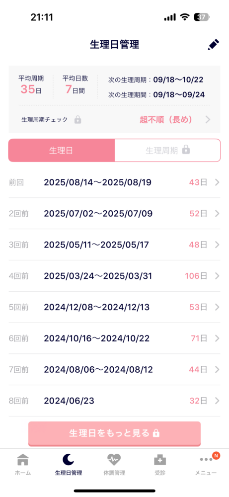 おはようございます。 画像を確認しました。 生理開始日:8/14 直近周期日数:43,52,48,106(),53,71,44