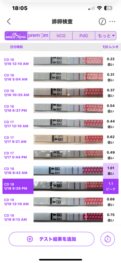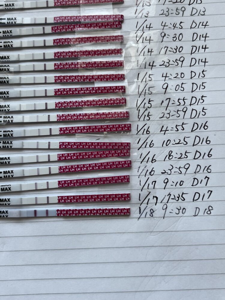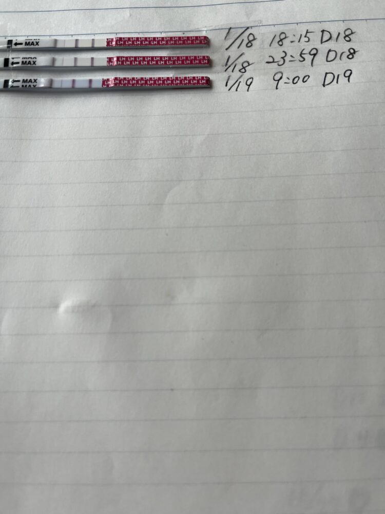 1/17(D17)から濃くなり、1/18(D18)の9:30と18:15は強陽性反応、 1/18の24時~1/19AM9時は陽性反応です。 この流れから判断すると、1/19(D19)昼~夜に排卵する可能性が高いです。