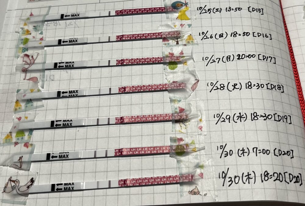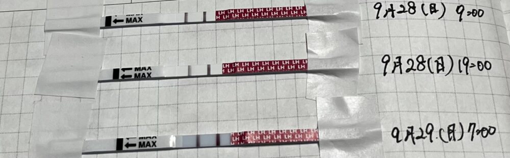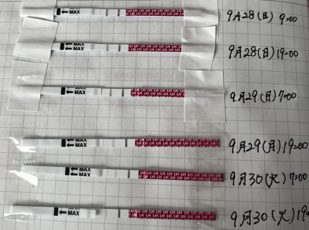 9/28夜と9/29朝は陰性反応と判定するのは一般的ですが、でも今回、普段は判定線がほぼ出ない陰性反応だったので、9/28夜~9/29朝は弱陽性反応と見ていいかなぁと思いました。