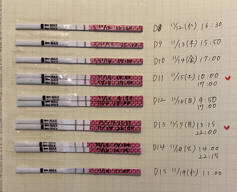 こんにちは。 11/16(D12)から濃くなり、11/17(D13)は強陽性反応、 11/18(D14)の14時は陽性、22時は陰性反応に戻りました。 排卵検査結果から見て、11/18(D14)夜に排卵した可能性が高いです。