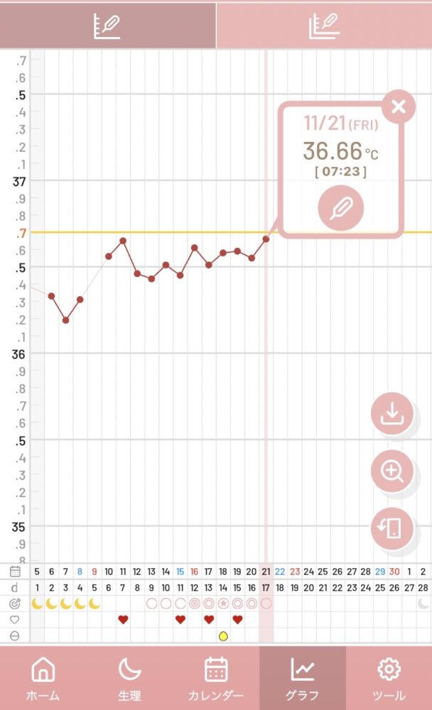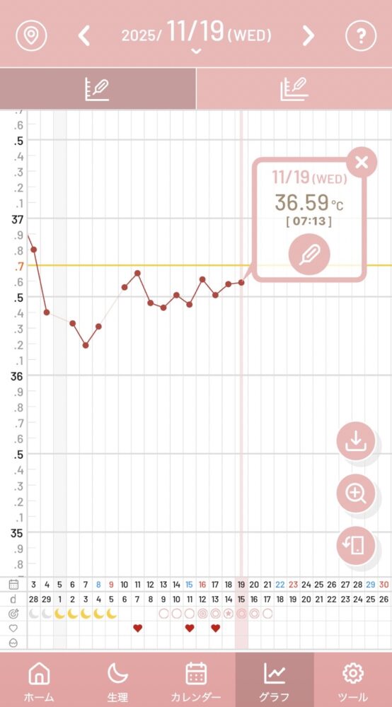 無事、19日の夜にもタイミングを取る事が出来ました。ただ中々高温期に入らず少し心配になっています。徐々に上がる方もいるのでしょうか…。