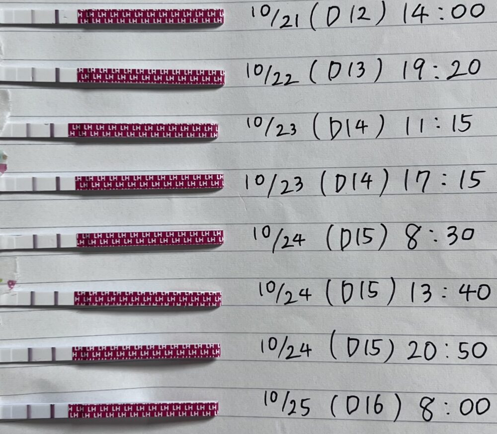 こんにちは。 画像を確認しました。 10/24(D15)朝は陽性、13:40は強陽性反応です。 排卵検査薬から見て、明日10/25(D16)は排卵日になる可能性が高いです。