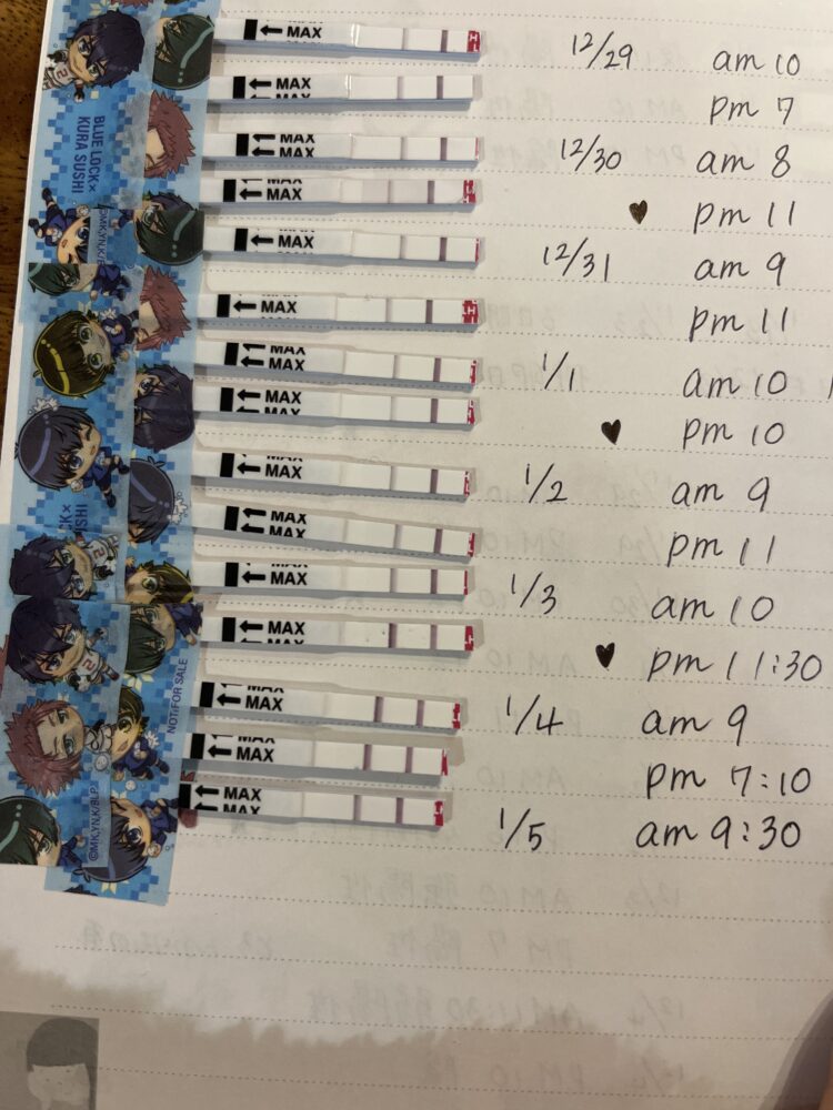 1/3の夜~1/4の夜は陽性反応、1/5の朝から薄くなっていますね。 この結果から見ると、1/5が予測排卵日と考えられます。