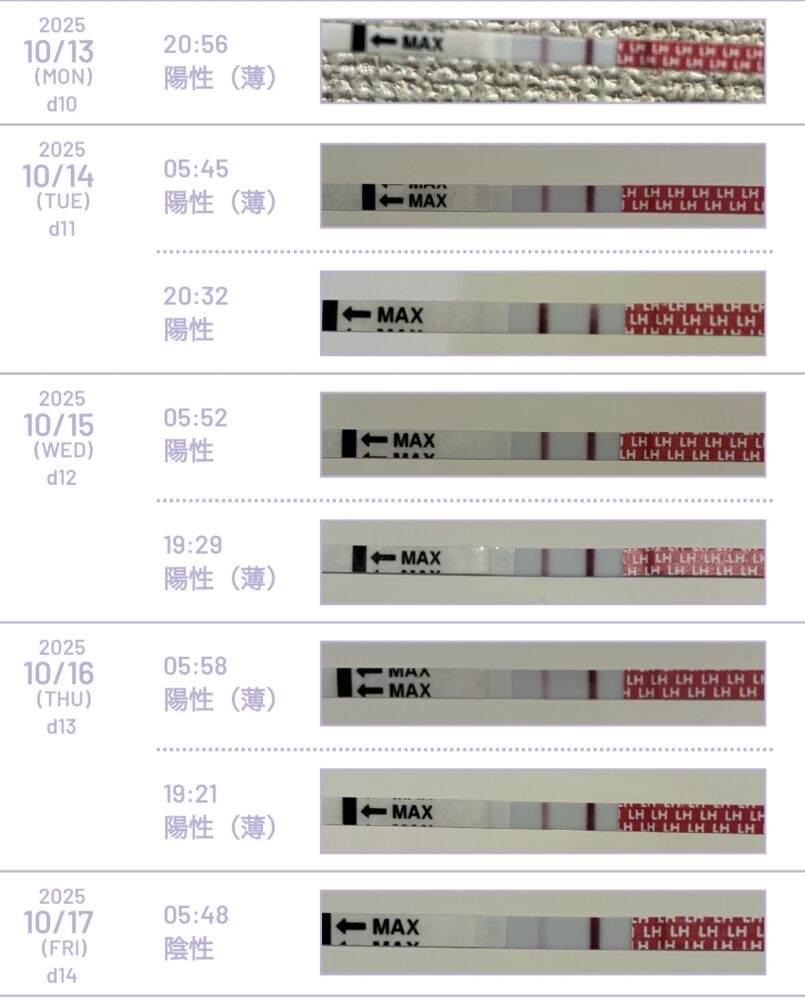 排卵検査薬が強陽性になった日(10/14 )の夜とその2日後(10/16)の夜にタイミングをとりましたが、その翌日(10…