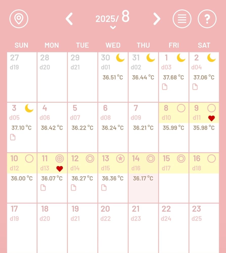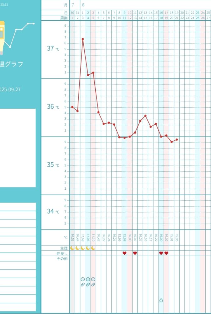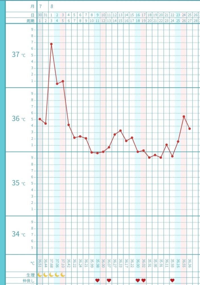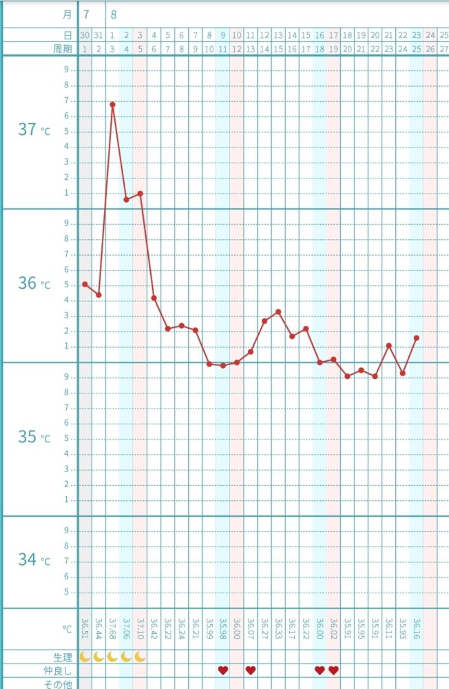 22日夜タイミングを取れて本当に良かったです。 この場合、8/24を高温期1日目と見ていいと思います。