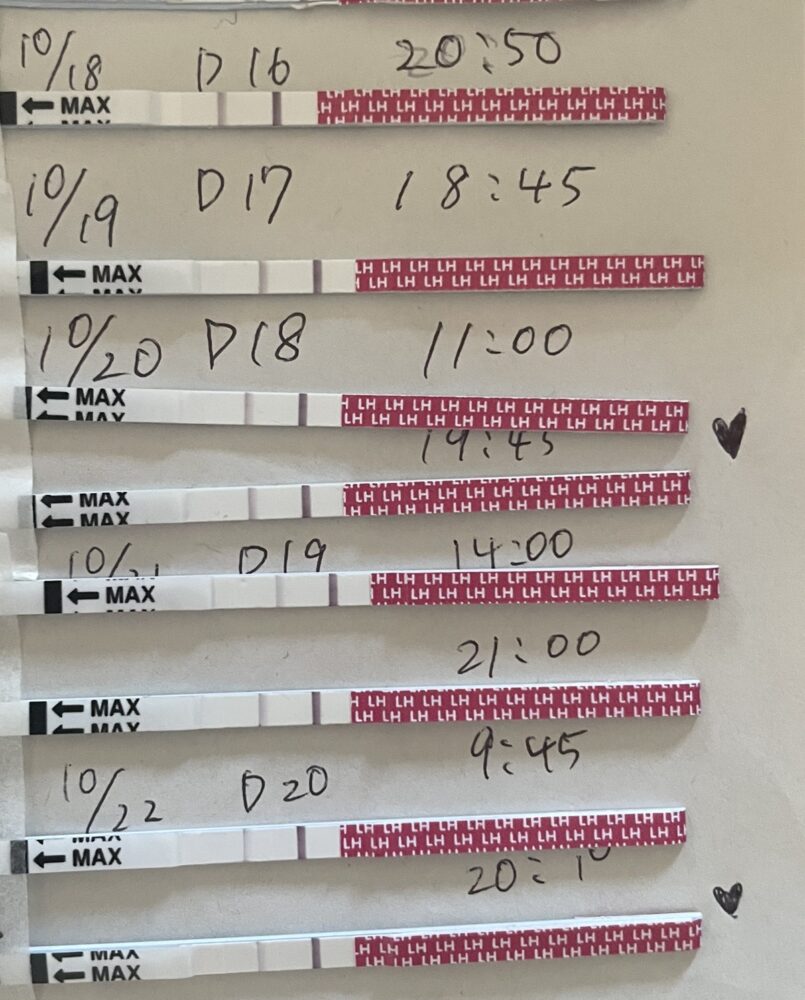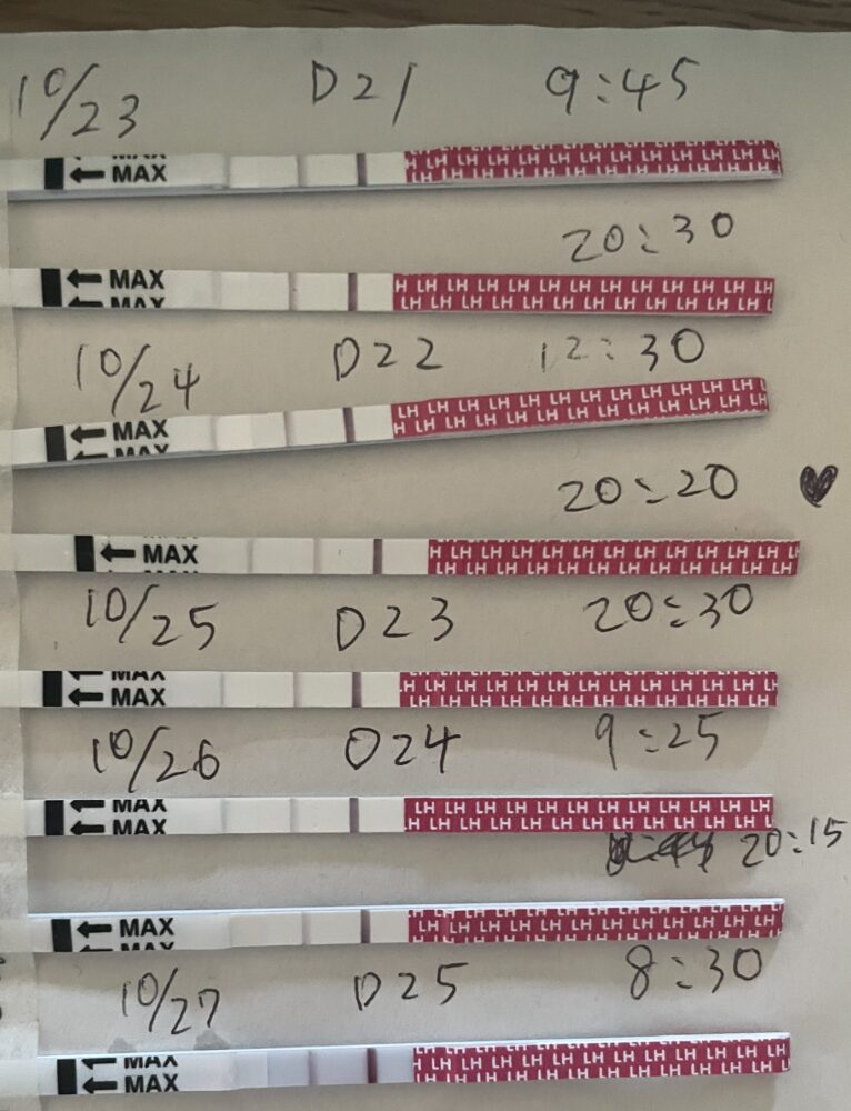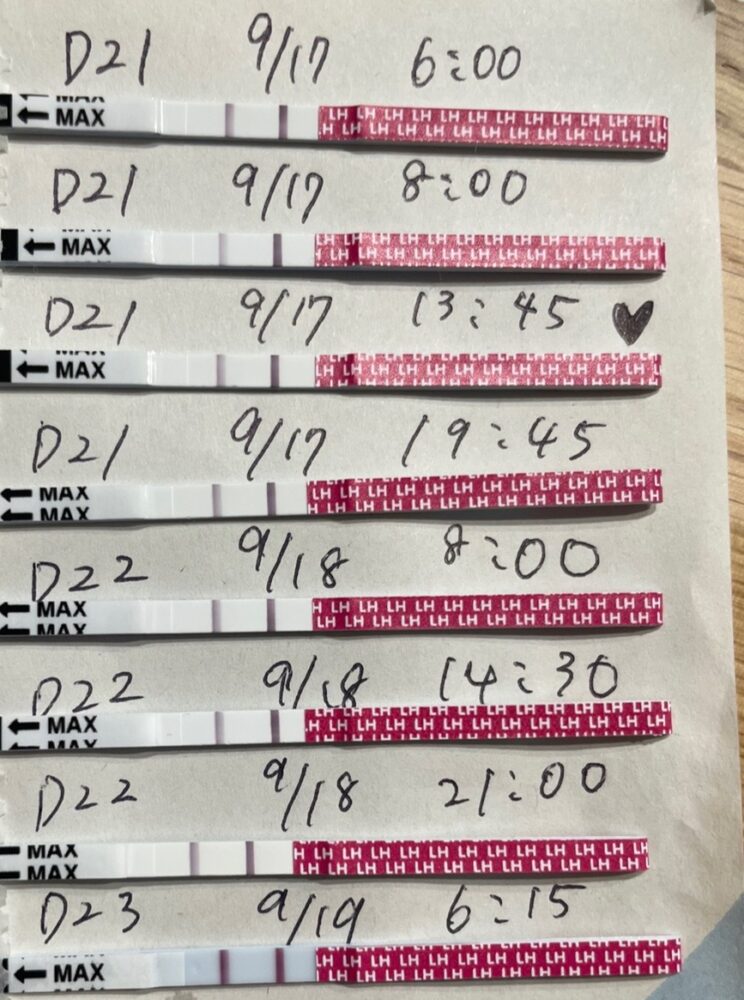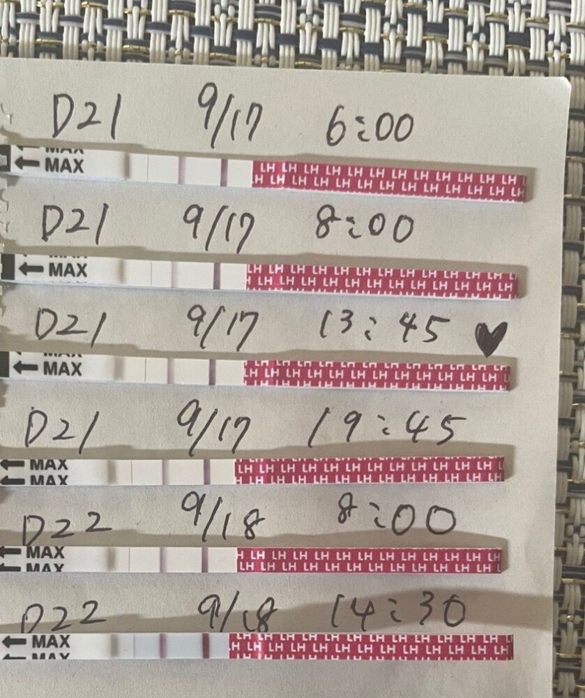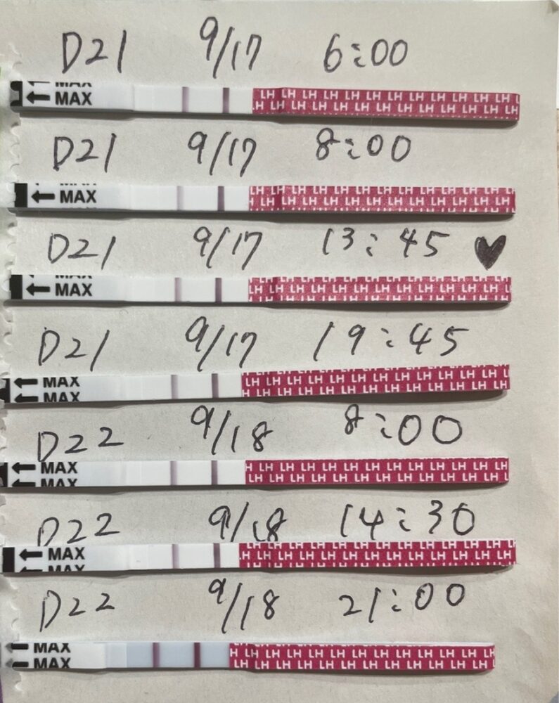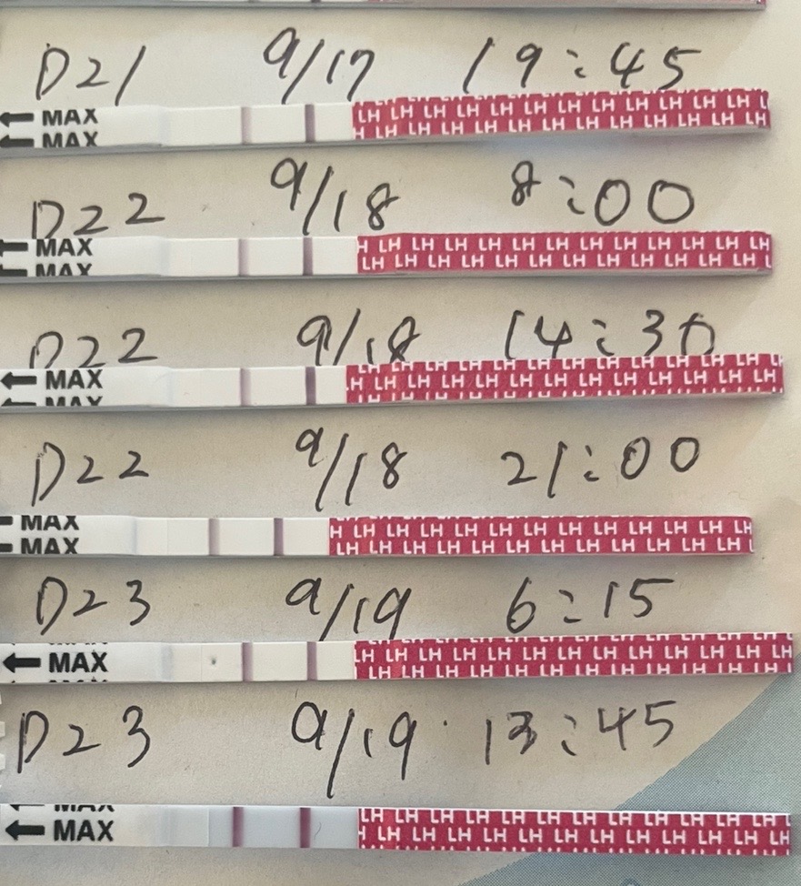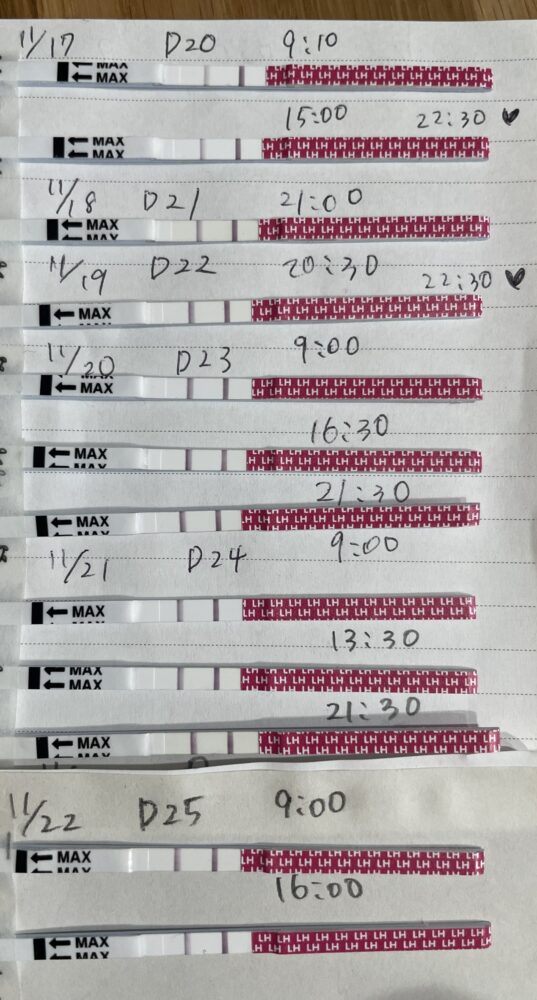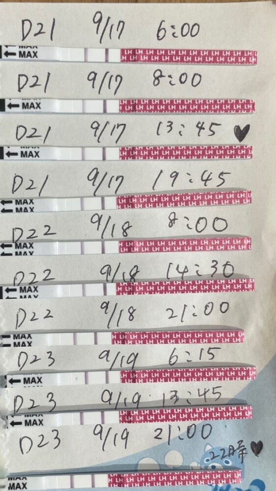 最初は、毎日1回(なるべく同じ時間帯に)検査を開始してください。 判定線が濃くなってきたら、1日2回(朝と夕方)などに回数を増やすと、ピークを見逃さずに捉えられます。