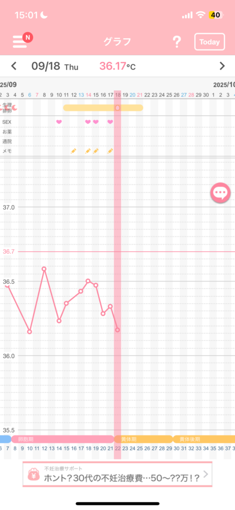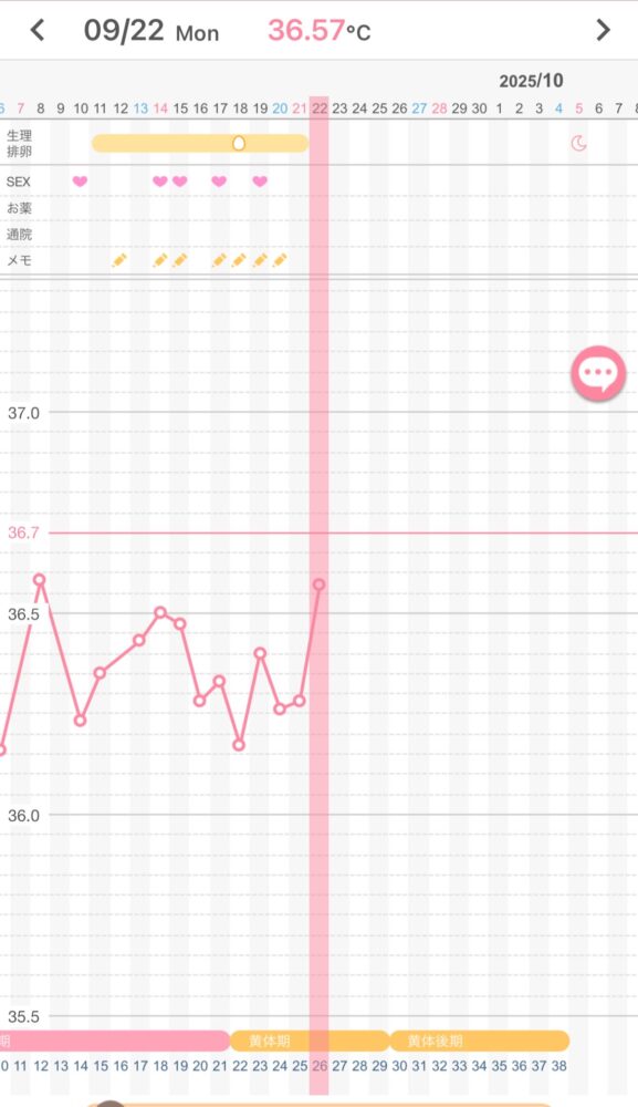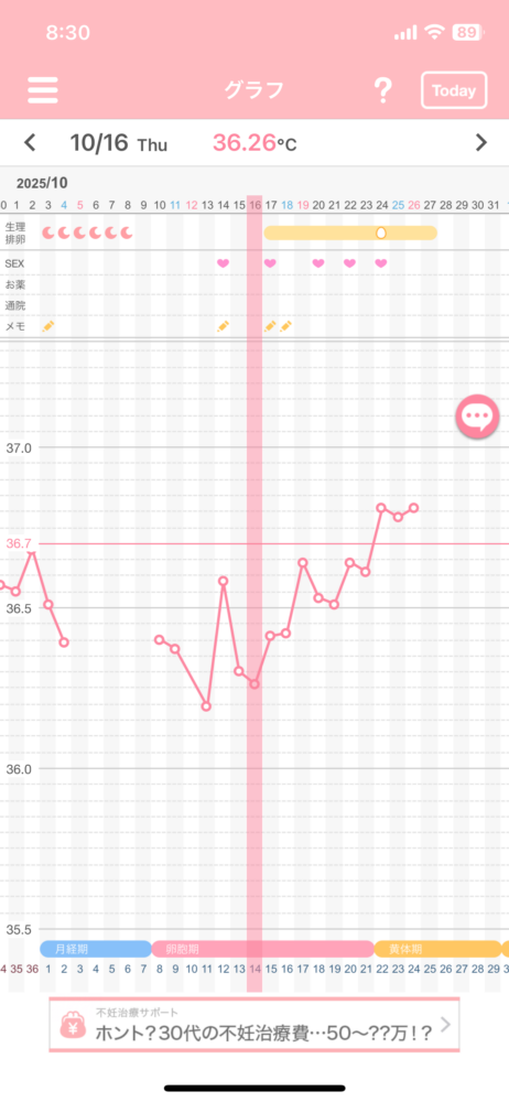基礎体温の記録から見れば、低温期最終日の18日(D16)は予測排卵日になります。 14日と17日のタイミングは妊娠に繋がる可能性があります。