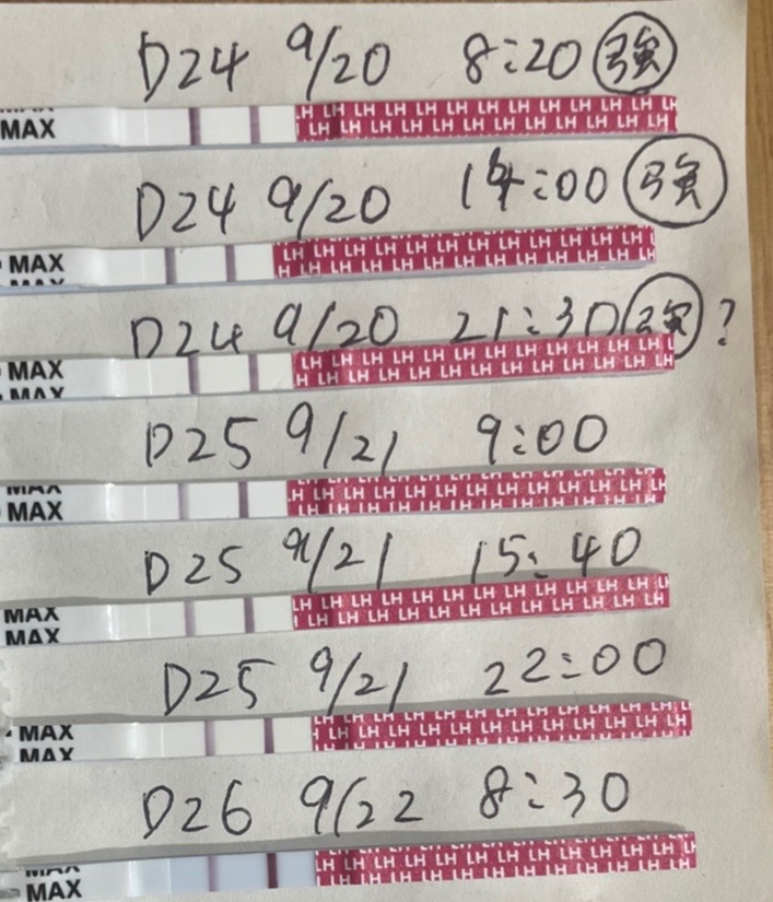 おはようございます。 19日晩は陽性で、20日(D24)は1日強陽性で合っています。 排卵検査薬から見て、9/21(D25)朝~午前に排卵した可能性が高いです。