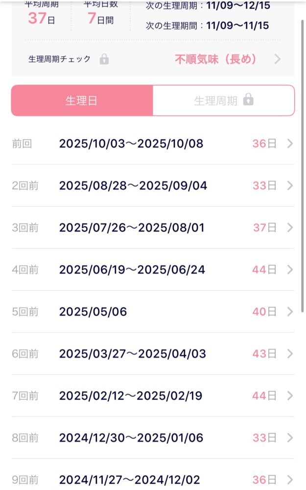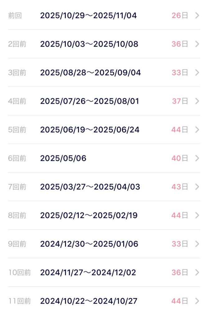 ご連絡ありがとうございます。 生理開始日:10/29 直近周期日数:26日,36日、33日、37日、44日