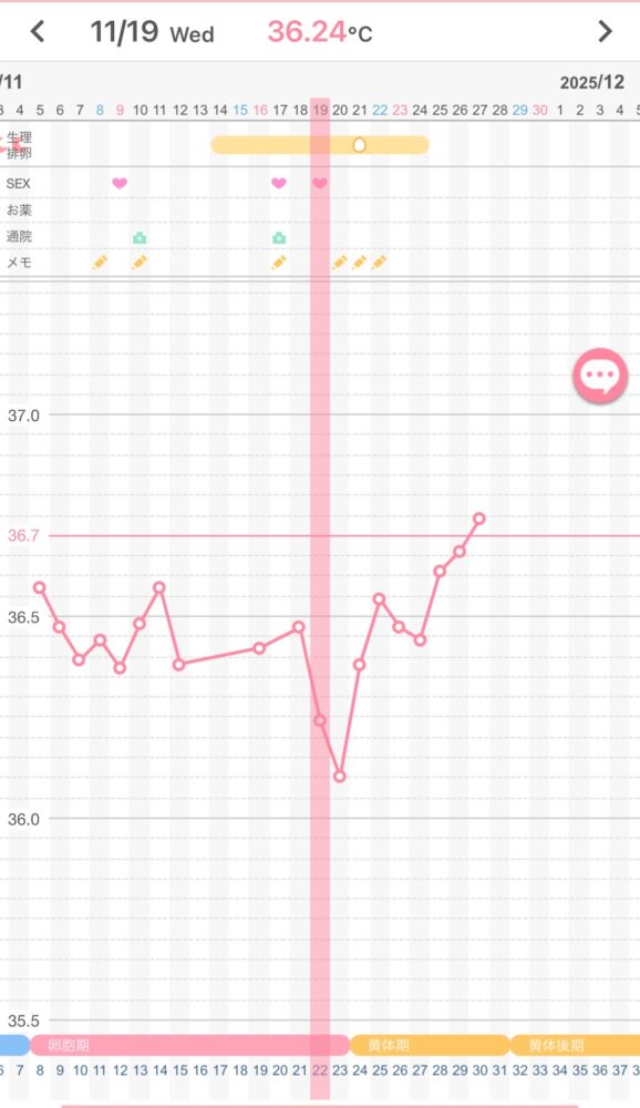排卵検査薬の変化と基礎体温から見ると、11/22 (D25) の朝に排卵した可能性が高いです。 女の子をご希望ということで、D20の夜とD22の夜(ゼリー使用)のタイミングはとても良かったです。