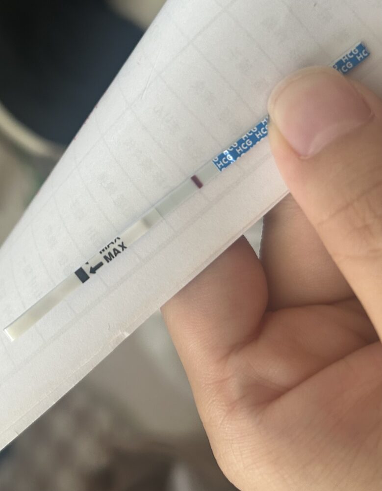 そうですね、写真でははっきりとは確認できませんが、確かに薄い線が見えているように感じますね。 非常に薄い線ですので、蒸発線の可能性も考えられますが、妊娠のごく初期である可能性もあると思います。