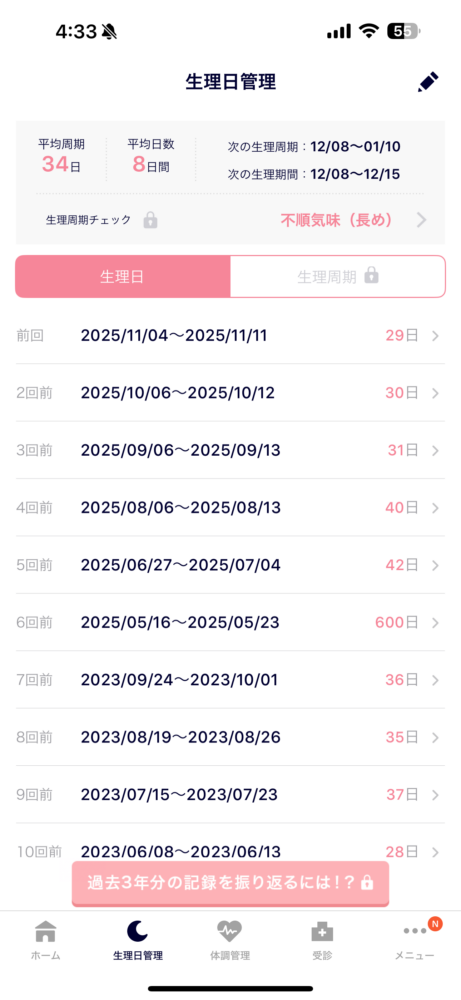 2人目の産後生理開始日が5/16でした。そこから安定しず生理周期がバラバラです。
