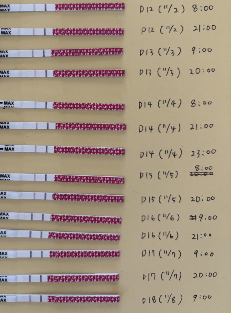 画像を確認しました。 11/6~11/7はくっきりの陽性反応、11/8朝から薄くなりました。 排卵検査薬から見て、11/8(D18)朝に排卵した可能性が高いです。
