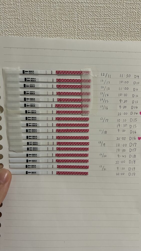 12/11ごろにおりものが出始めたので、排卵検査薬を使い始め、12/19がCよりも薄いですがピークで、そのあとは薄くなってきました。