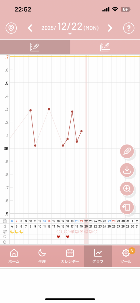 基礎体温は、起きる時間2時間ほど差があったり、計れなかったりしています。