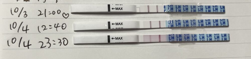 10/3 夜の排卵検査で陽性反応が出たため産み分けゼリーを使ってタイミングをとりました。 10/4 夜の検査で色が少し薄…