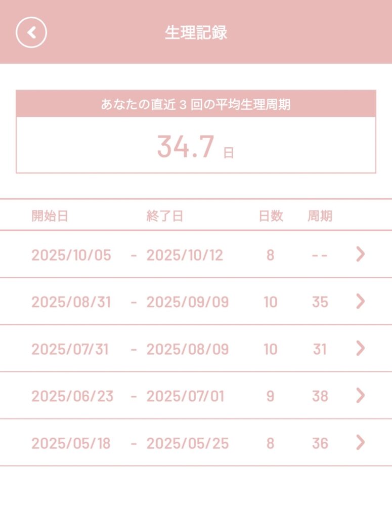 生理開始日:10/5 直近周期日数:35, 31, 38, 36