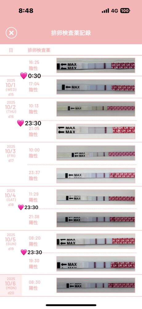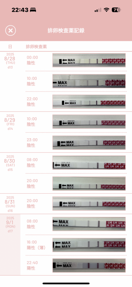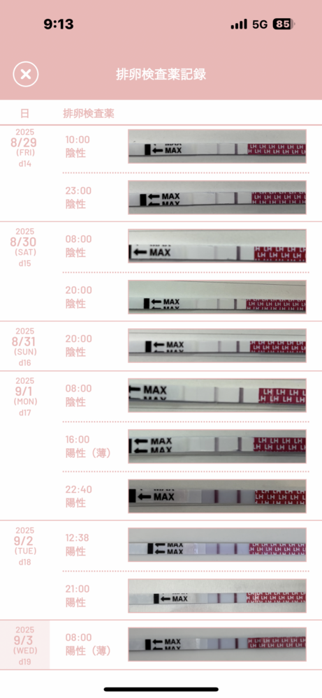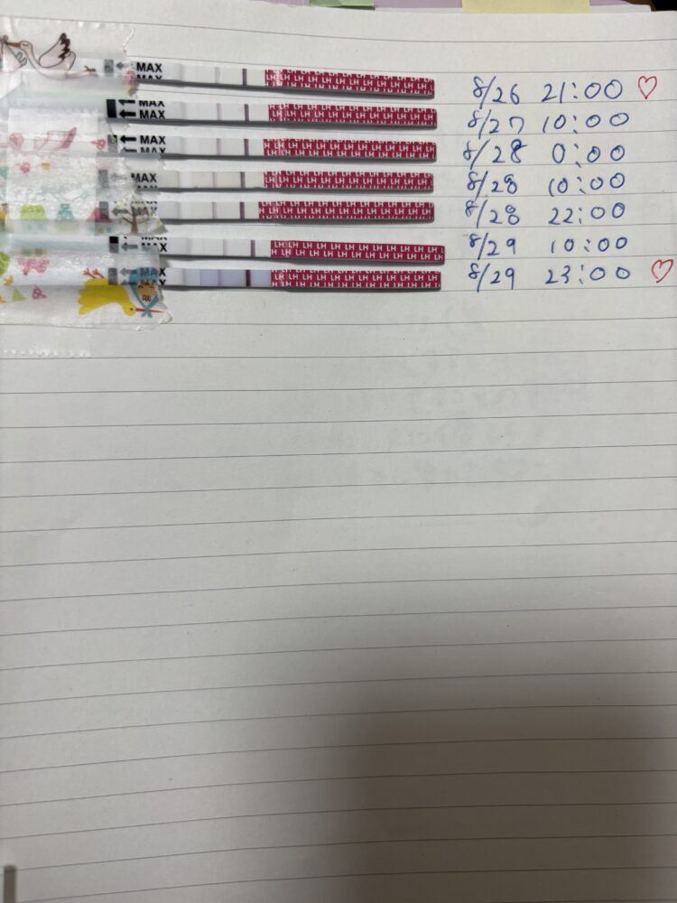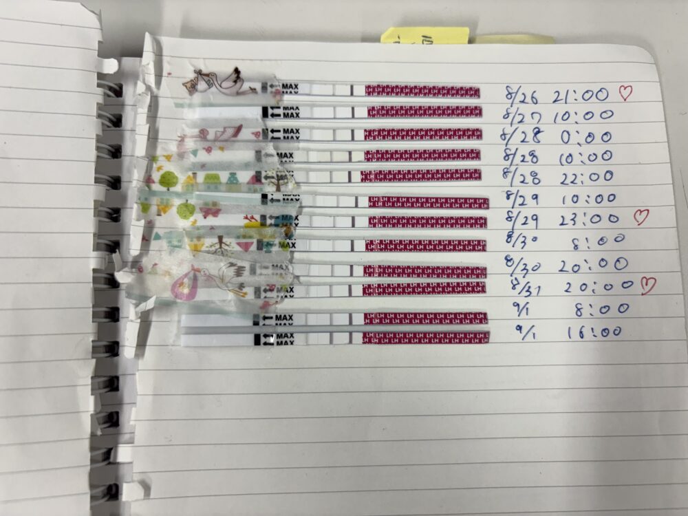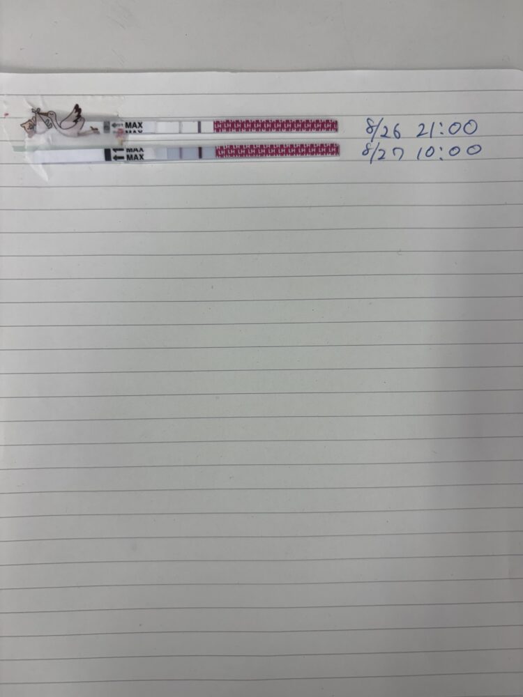 最初は1日1回でOKです。判定線が濃くなる傾向が見られましたら、1日2回の検査に切り替えてください。
