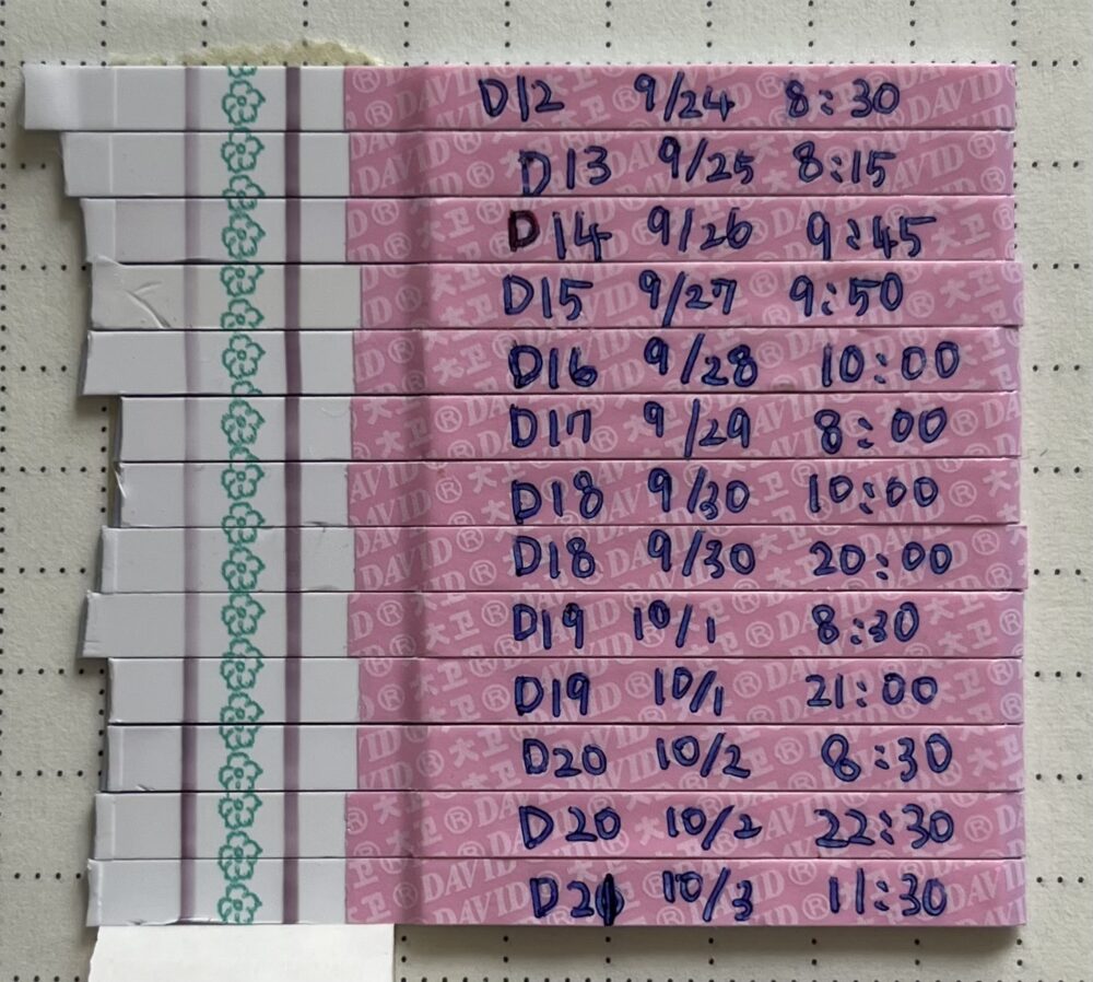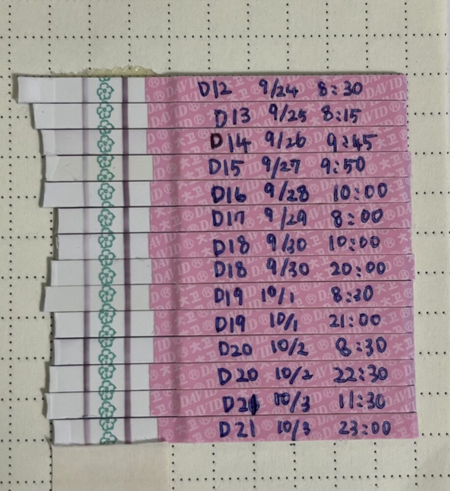 排卵検査薬は、陽性反応が出る1~2日前から線が濃くなり始めます。こまめに検査(毎日大体同じ時間帯+1日2回など)をして、その変化を追うことで、より正確にLHサージの開始を捉えられるようになります。