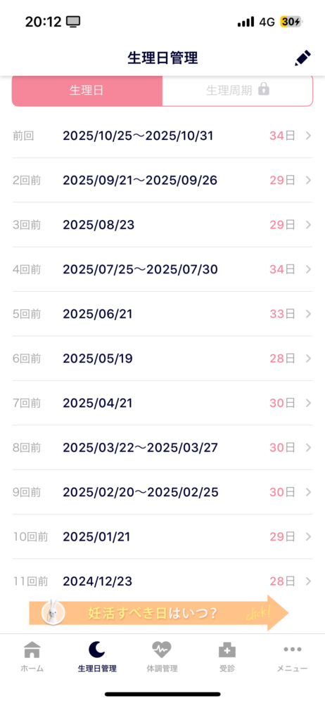 直近周期日数:34,29,29,34,33,28,30,30