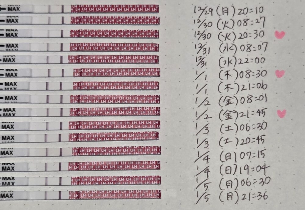 1/1と1/2に検査したものが少し濃い気はするのですが、アプリだと昨日か今日が排卵予定日でした。いつ排卵したのでしょうか?そのあとの検査であまり薄くなってはいないので排卵日について教えて頂けると嬉しいです。ハートのマークの所でタイミングを取りました。