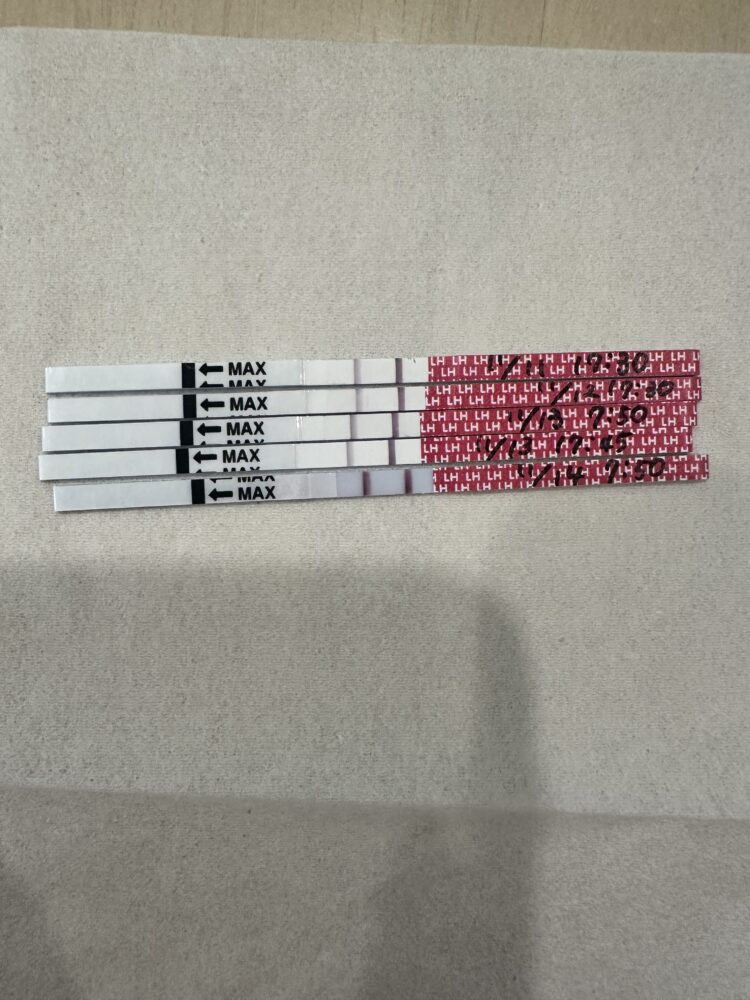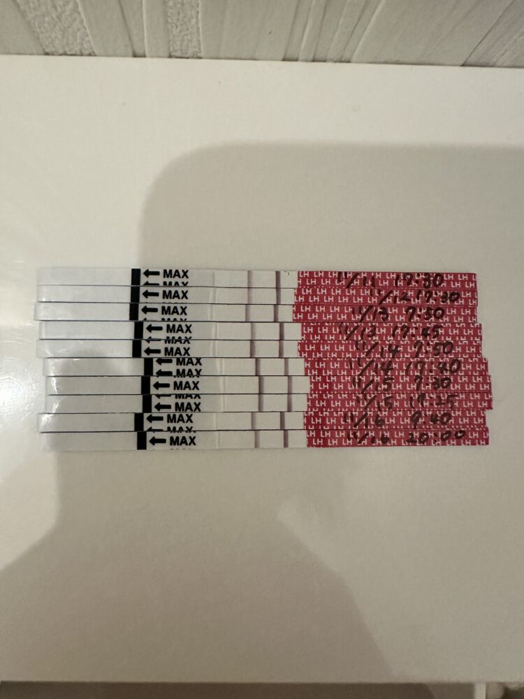 11/13の夕方までは陰性でしたが、11/14の朝にはくっきり陽性になりました。 この検査結果から考えると、排卵日は明日11/15となる可能性が高いです。