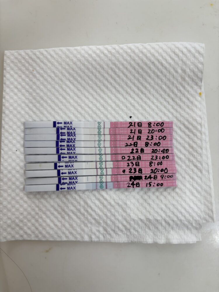 検査薬の変化から見ると、24日のお昼頃に排卵があった可能性が高いです。
