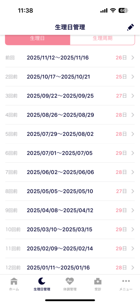 直近の周期日数:26, 25, 27, 28, 28, 29, 28日
