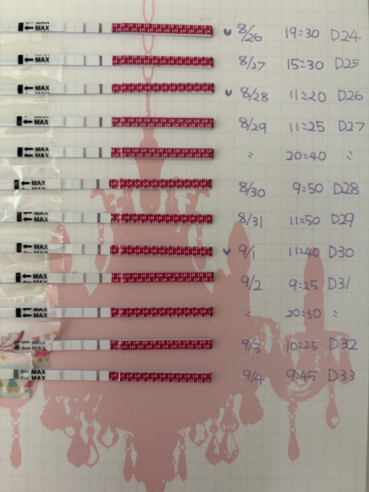 生理周期が長めで検査回数が多くなり大変だと思いますが、排卵検査薬は妊娠への近道です。排卵検査開始日から間を開けずに10~12時間間隔で1日2回の排卵検査薬か、1日1回の排卵検査薬と基礎体温の計測のセットで進めることをおすすめします。