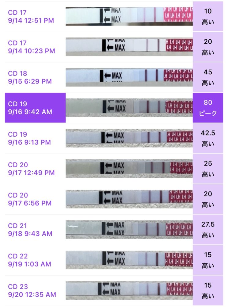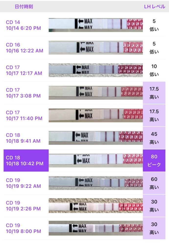 10/17から反応が濃くなり始めて、10/18朝~10/19朝が強陽性、 10/19午後と夜は弱陽性でした。 検査薬の結果から、10/19(D19)夜~10/20(D20)朝に排卵した可能性が高いです。