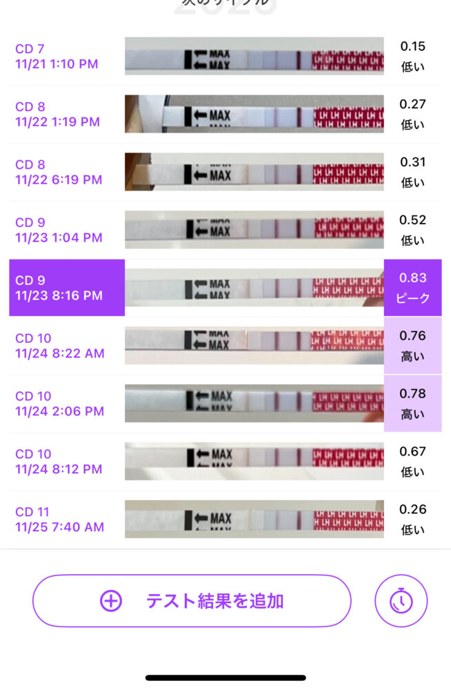 11/21から排卵検査薬を使わせていただいてます。 画像を見ていただいたらわかるとおもうのですが、 11/23のピークから緩やかに数値が下がり 11/24の20時には0.67 11/25の朝には完全に排卵が終わった数値になっています。 11/24に排卵したのはわかるのですが 具体的に何時から何時の間に排卵したのかわかる方いらっしゃいますか?