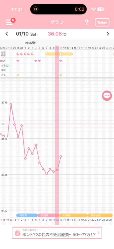 妊活を開始したためこちらで排卵検査薬を購入しました。前回の生理が12月30日〜1月3日でアプリでの排卵予測は1月11日の…