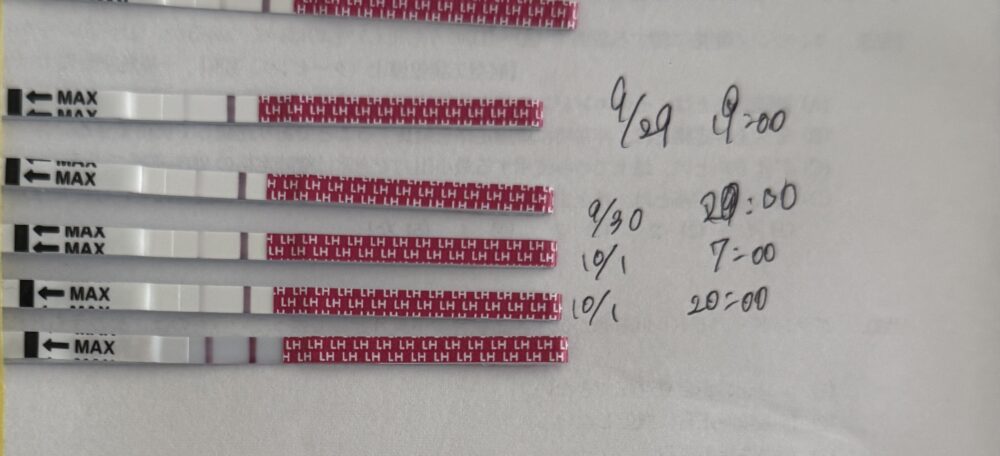 これまで排卵検査薬を数ヶ月利用してきました。 今までは徐々に陽性側の線が色付いていましたが、今回は本日の朝(添付写真の1番下が本日10/2の朝です)いきなり反応し始めました。 こちらは陽性という事でしょうか。 昨晩タイミングをとっています。 タイミングについてもご助言いただけますと幸いです。