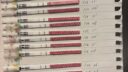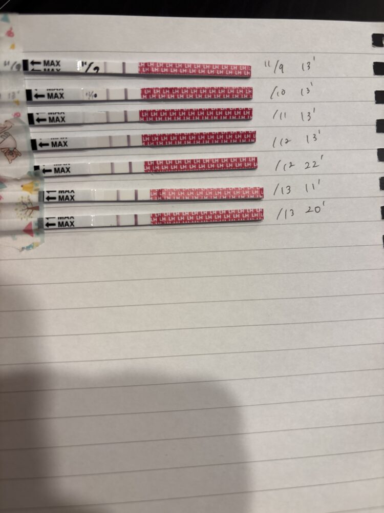 初めまして。 前の周期は日本製の排卵検査薬を使用し、今回初めてラッキーテストを使用します。 結果の判定が難しくご質問したいです。 この中で陽性反応はありますでしょうか? 11/22 22時は写真では濃くみえるのですが、実際には左端だけ濃くてグラデーションで薄くなっています。