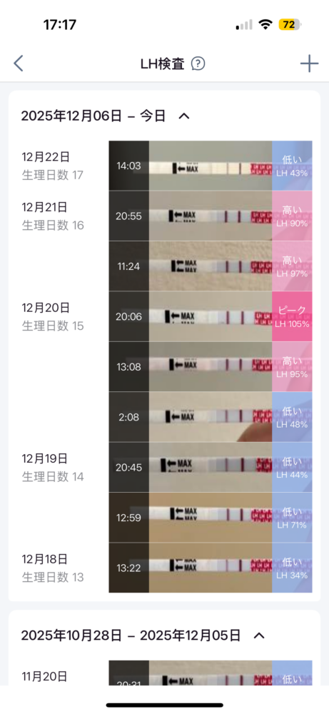 11/9(D13)~11/13(D17)は陰性反応です。 過去の周期から推測すると、そろそろ陽性反応が出現する時期にきています。 排卵が近づいている可能性を考慮し、今夜~明日にタイミングを取られると安心です。