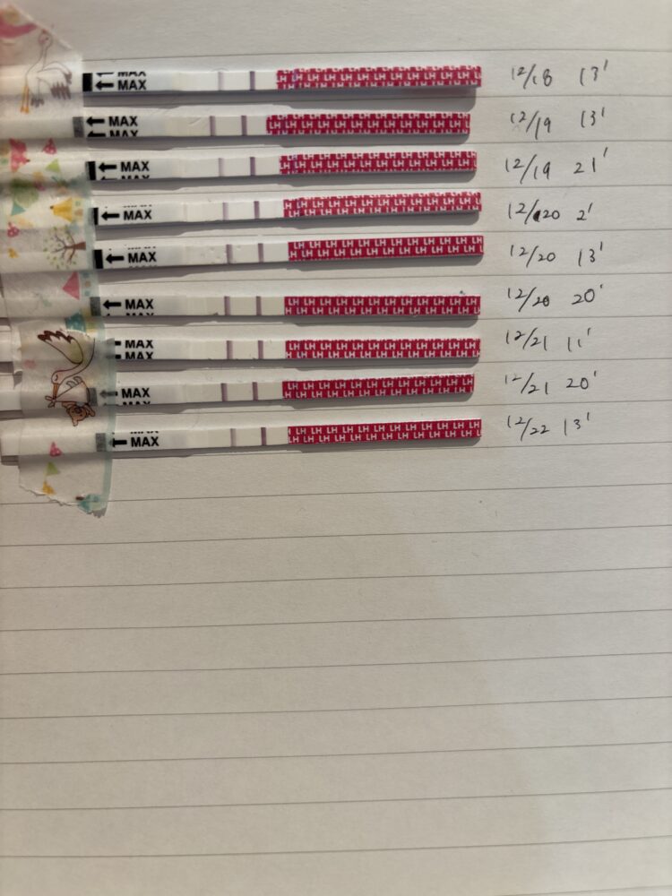 12月20日昼~12月21日夜は、くっきりとした陽性反応が出ていますね。 排卵検査薬の変化から見ると、12月22日の朝~午前に排卵した可能性が高いです。