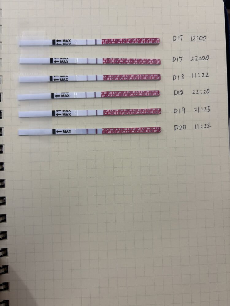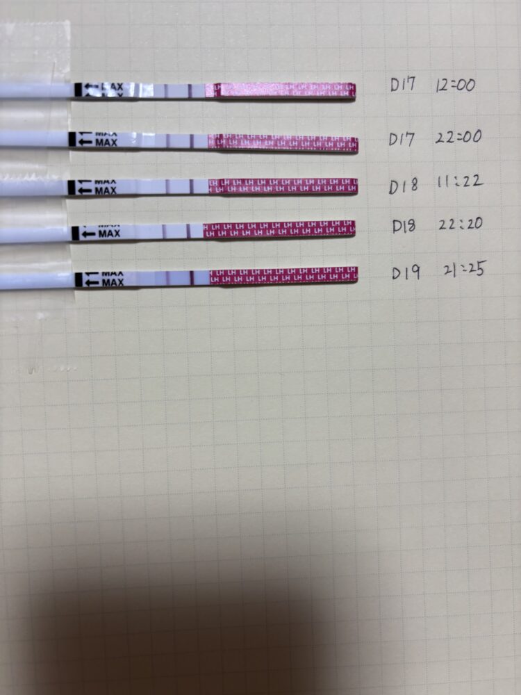 こんにちは。 基準線に比べて判定線が薄いので、D17~D20は陰性反応です。 排卵はまだ先になると思います。