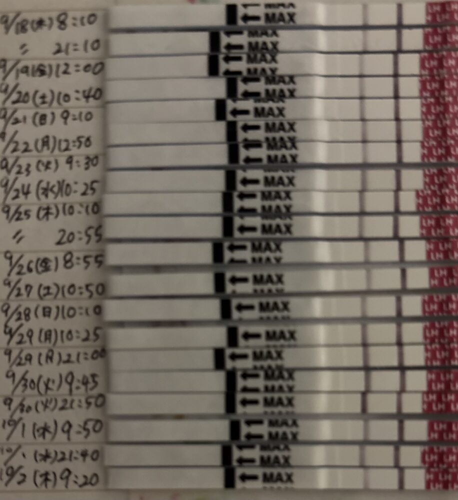排卵検査薬は、9/29から陽性反応が出始め、9/30夜は強陽性反応です。 検査結果から見れば、10/1(D28)朝に排卵した可能性が高いです。